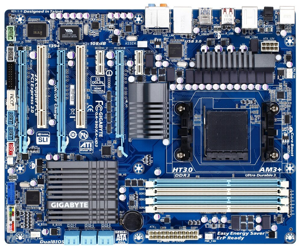 The 990XA-UD3 motherboard is designed to offer a stable, high-speed platform for delivering amazingly fast data transfer via the GIGABYTE 333 onboard acceleration technologies. Featuring the USB3.0 controller, AMD 900 series motherboards allow users to take advantage of super fast USB transfer rates of up to 5Gbps, delivering 10x faster data transfer compared to USB 2.0. Utilizing the industry's first Serial ATA Revision 3.0 solution via AMD SB950 chipset, GIGABYTE AMD 900 series motherboards offer native 6 ports of next generation high speed data storage devices support with data transfer speeds of up to 6 Gbps with RAID 0, 1, 5, 10. The AMD 900 series motherboards introduce a unique hardware design with lower resistance fuses for ensuring lower voltage drops and providing more stable and plentiful power delivery. All USB ports also benefit from a 3x power boost for better power delivery to power hungry USB devices.