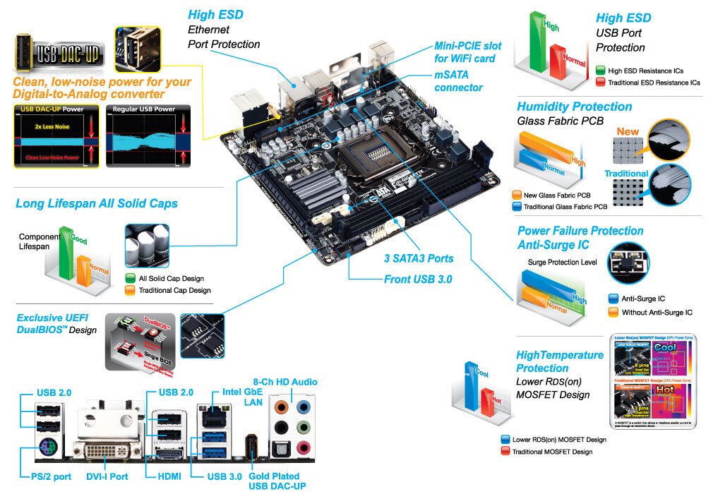 GIGABYTE 8 Series motherboards raise the bar in terms of protecting your system, providing advanced electrostatic discharge (ESD) protection for both your Ethernet LAN and USB ports, both common sources of ESD-related failures. Each LAN and USB port is paired with a dedicated protection filter that can withstand high electrostatic discharges, protecting your system from common electrical surges and even direct lighting strikes.