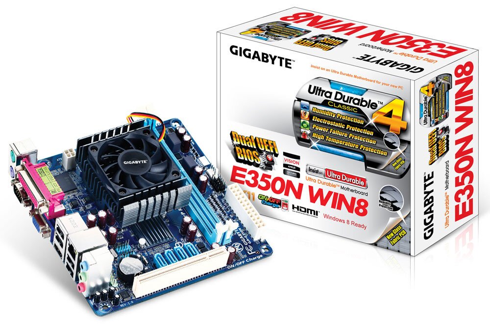The new addition to GIGABYTE's small form factor HTPC motherboard range features AMD Fusion Technology with DirectX 11, an HDMI interface, as well as a host of unique high-end GIGABYTE features such as Ultra Durable 4 Classic and On/Off Charge. Powered by the AMD E-350D Dual-Core Processor with AMD Radeon HD 6310 graphics (DX11), the GIGABYTE GA-E350N WIN8 motherboard provides exceptional Blu-ray high definition content playback unmatched by previous integrated graphics solutions.
