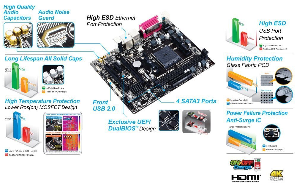 GIGABYTE uses Solid Caps (Capacitors) for APU VRM and Low RDS(on) MOSFETs which are rated to work at higher temperatures to provide a longer lifespan.